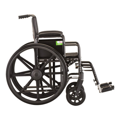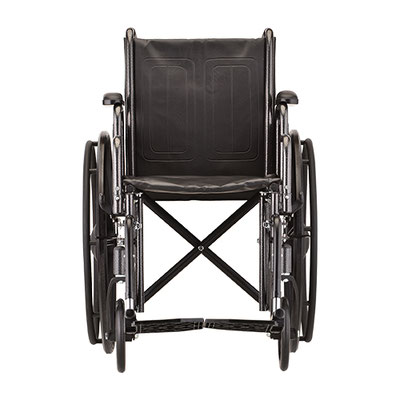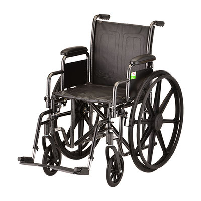 The Steel Wheelchair 18 in. (5186S) comes equipped with detachable and reversible full arms and swing away footrests. It also features dual axle positions for quick seat height conversion and flame retardant black nylon upholstery. There are industry compatible accessories available for this product.