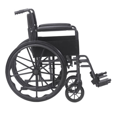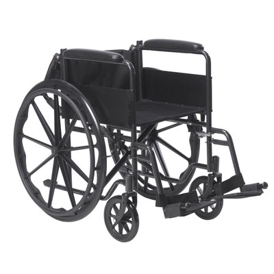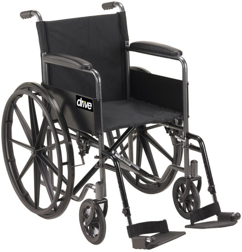The Silver Sport I Wheelchair with Fixed Arms and Swing Away Footrests by Drive Medical comes in an attractive powder coated, easy to maintain silver vein finish, and a steel frame for durability. The urethane tires are mounted on composite wheels to provide durability and a smooth ride over most surfaces. The convenient carry pocket on the backrest provides an easy and safe way to transport personal items. The nylon upholstery is durable, lightweight, attractive and easy to clean. Comes standard with swing away footrests, push to lock brakes and plastic footplates.